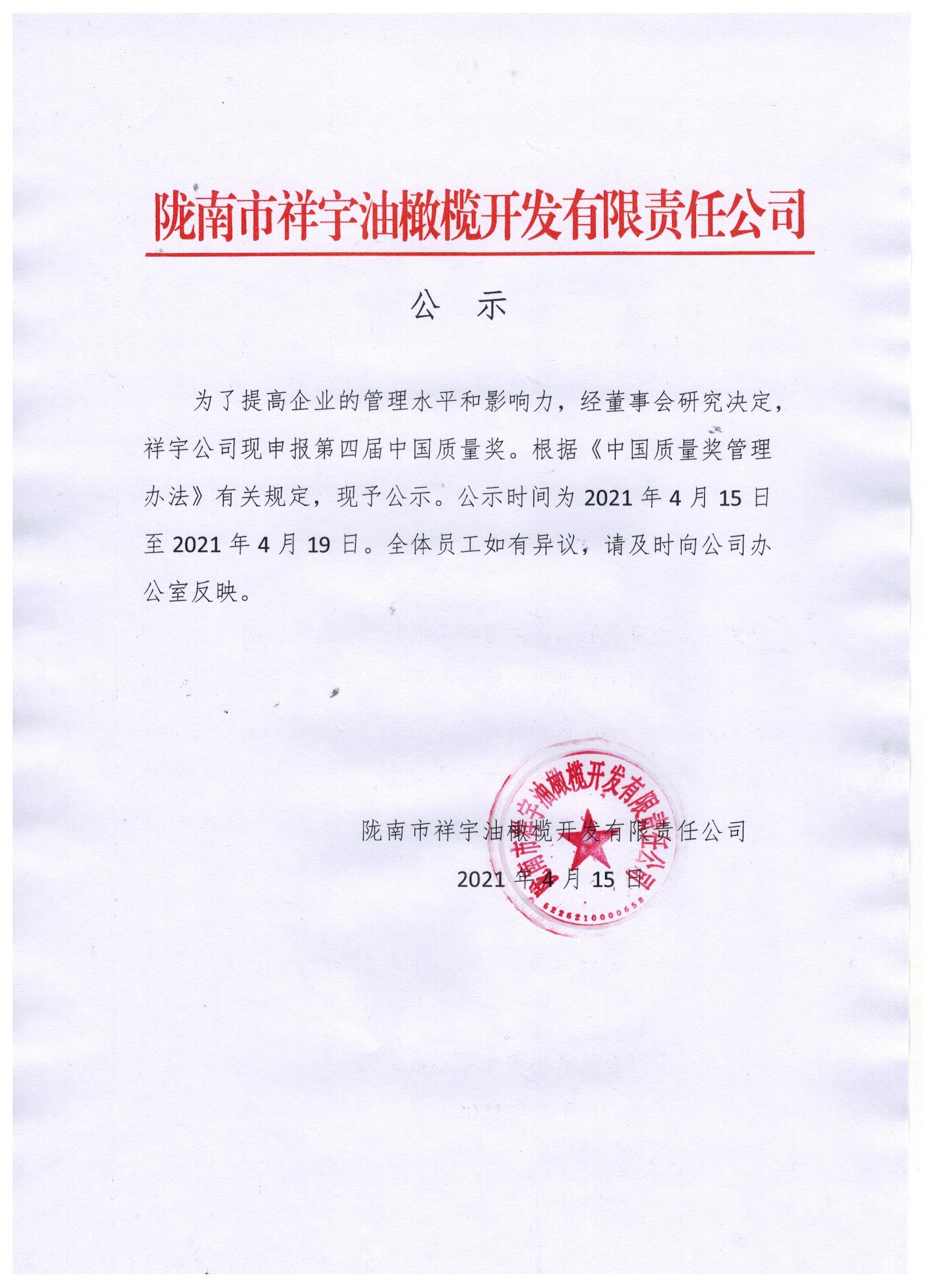 隴南市祥宇油橄欖開發(fā)有限責(zé)任公司關(guān)于申報第四屆中國質(zhì)量獎的公示